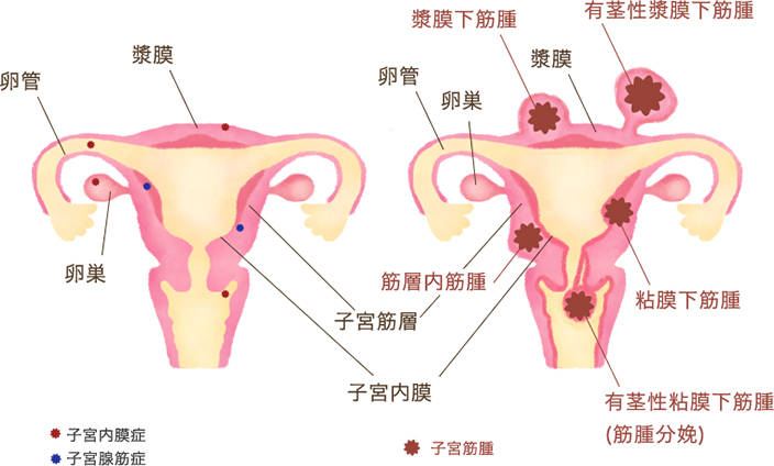 子宮内膜と似た組織が子宮壁(筋肉層)に増え、子宮壁が厚くなります。生理の出血量が増えたり、強い痛みを起こしたりします。